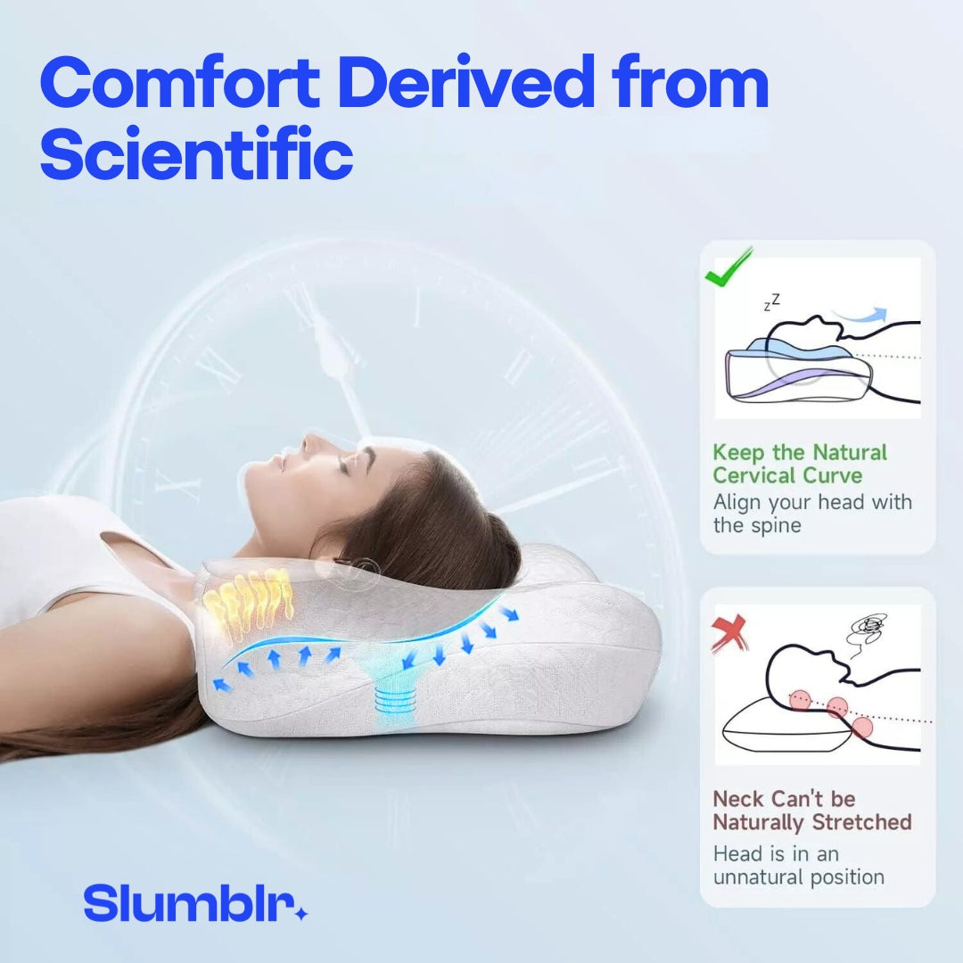 The Slumblr Relief Pillow is uniquely designed to provide optimal support and comfort, specifically targeting relief for cervical pain and neck stiffness. Its ergonomic contouring and memory foam construction offer personalized support by conforming to the natural curvature of the neck and head.